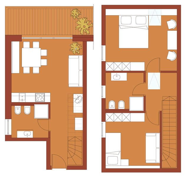 In these holiday apartments the living area is on the lower floor and the bedrooms are on the top floor.