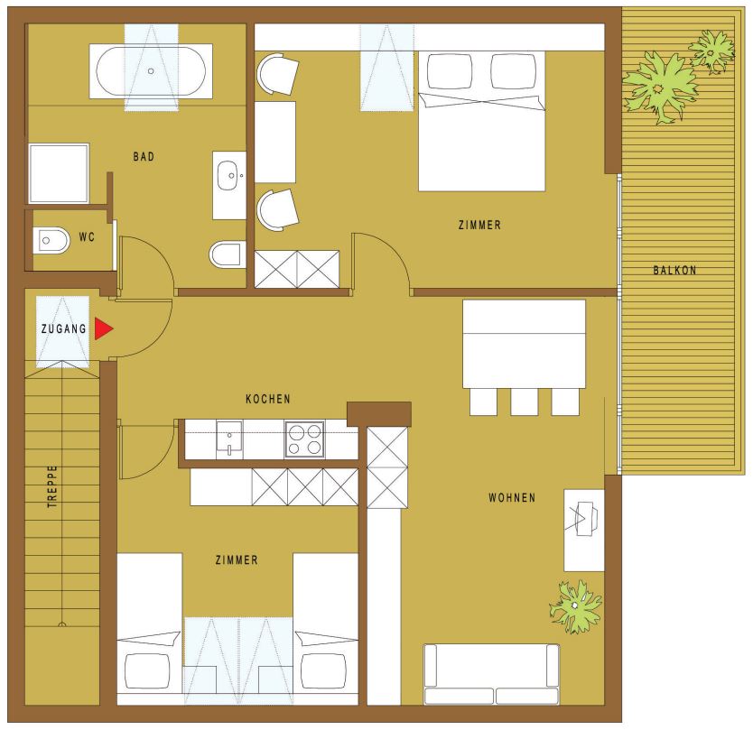 Dieses Appartment befindet sich im zweiten Stock und bietet einen wunderschönen Blick zum Kronplatz. In diesem Appartment befinden sich der Wohnbereich und die Küche, sowie die beiden Schlafzimmer und das Bad auf der selben Etage. Im großzügigen Badezimmer finden Sie eine Badewanne, Bidet und Dusche. Dieses Appartment ist ideal für 3 bis 4 Personen.